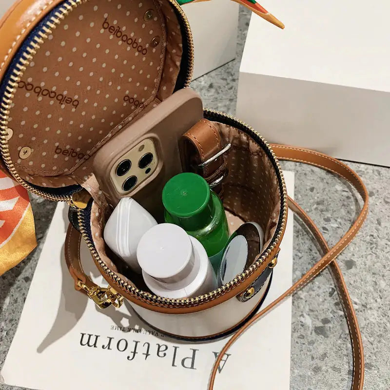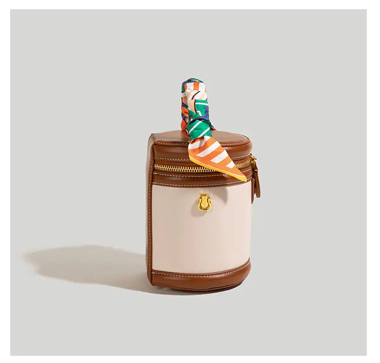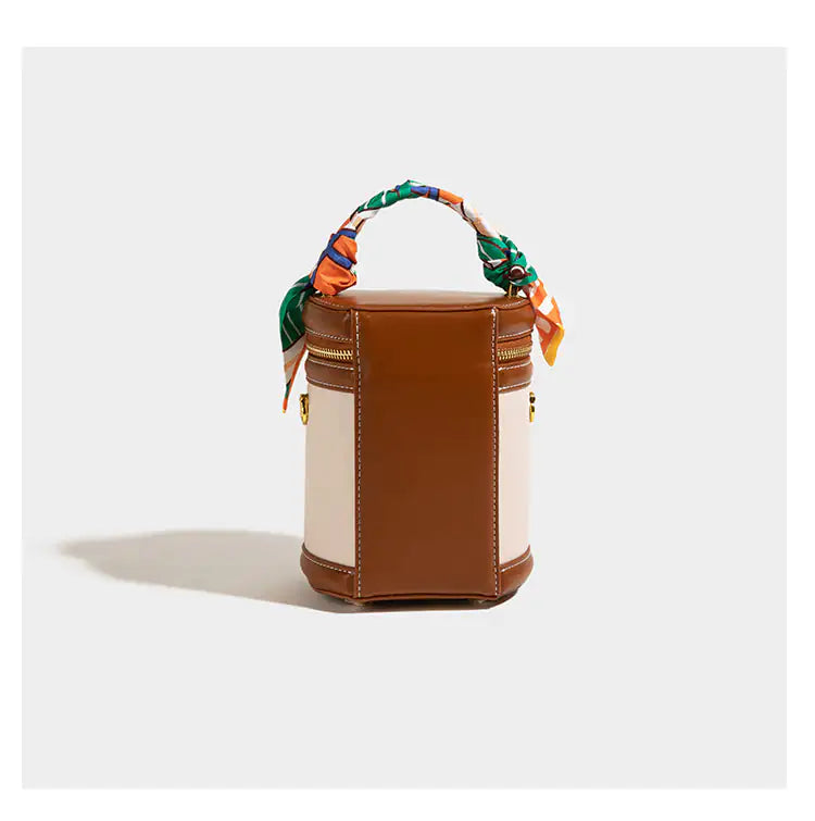 **Functional Sophistication:**Featuring a scarf-adorned top handle, this bag doesn't compromise on practicality. Ample compartments ensure organized storage for essentials, while the cylindrical shape adds a touch of uniqueness.