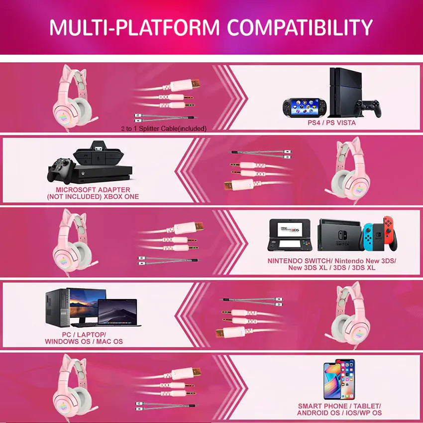Cute Cat Ear Headphone with Mic is the perfect headphone for gamers and music lovers. It is equipped with noise cancelling technology and LED light that makes it the perfect choice for gaming and listening to music. The USB is just for the RGB light, when you plug the USB, the LED will work. If you don't want it on, simply don't plug the USB cable in. Our package include the splitter cable (2 audio jacks), which is required when using the headphone for PC. The green wire goes in audio and the pink wire in the mic jack.