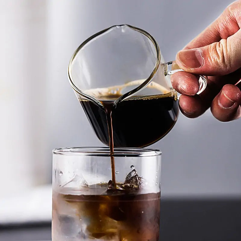 The Espresso Measuring Cup is a must-have for any coffee lover. This high-quality glass cup features double or single spouts for easy pouring, as well as a wood handle that provides a comfortable grip. The measurements are clearly marked on the side of the cup, making it easy to make a perfect cup of espresso every time. The heat-resistant glass means that you can use this cup for both hot and cold beverages, making it a versatile addition to your kitchen or home bar.