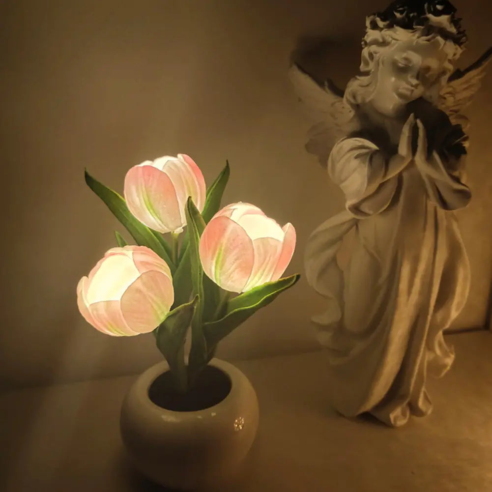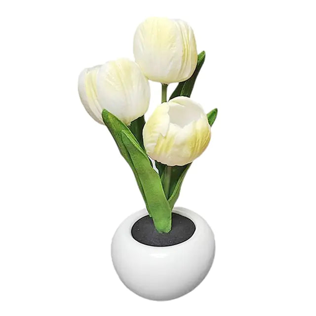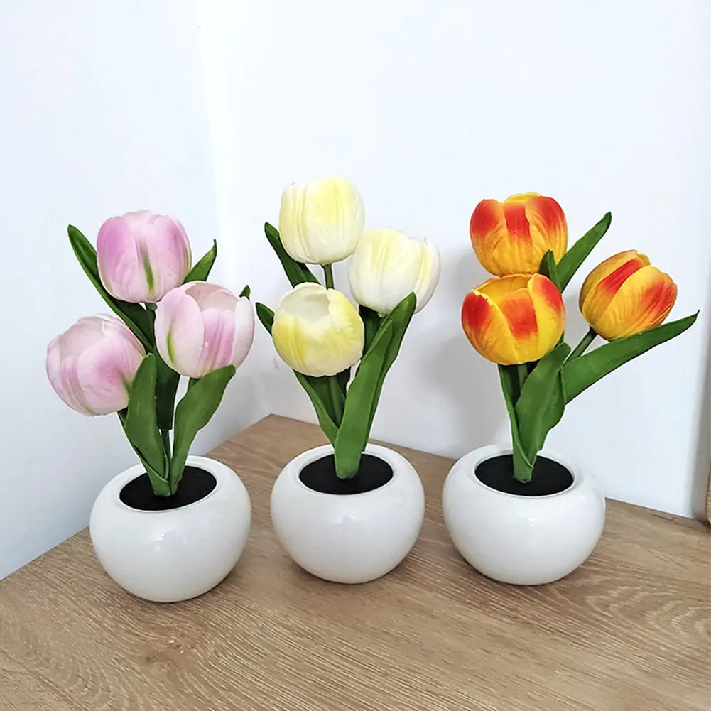 Introducing the Flowerpot Potted Table Lamp, a LED Tulip Night Light Flower perfect for room decorations. This artificial flower design is crafted with a combination of LED solid light source and high-simulation plant elements for an eye-catching look. The LED flower bonsai can be used both during the day and at night as a table lamp, creating warm and soft lighting to enhance any living space. This LED flower can make any desk or interior more stylish and sophisticated with its lively atmosphere. With its unique colorful design, adding this lamp to your décor will create an elegant bonsai that exudes spirituality and natural flavor. Give your home an upgrade with the Flowerpot Potted Table Lamp!