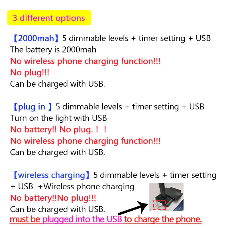 Introducing the Led USB Desk Lamp, the perfect solution for your lighting needs. This lamp features 5 dimmable levels, a timer setting, and a USB charging port, making it super convenient and easy to use. The 2000mAh battery gives you plenty of power to keep the light going, and the wireless phone charging function means you can always stay connected. Best of all, the sleek and modern design is sure to complement any space. So don't wait any longer, get the Led USB Desk Lamp today!