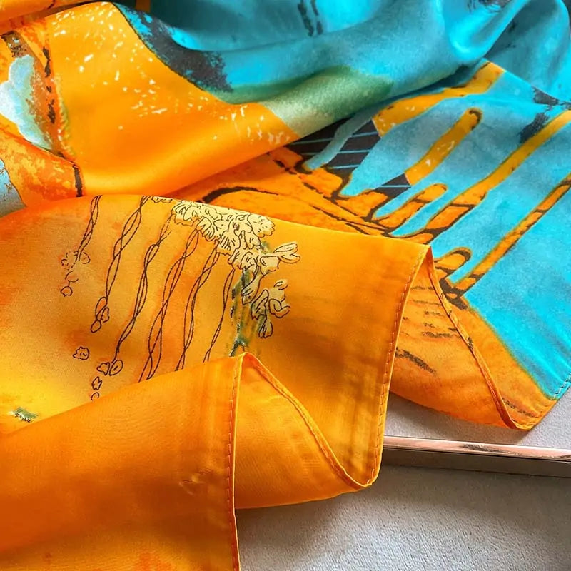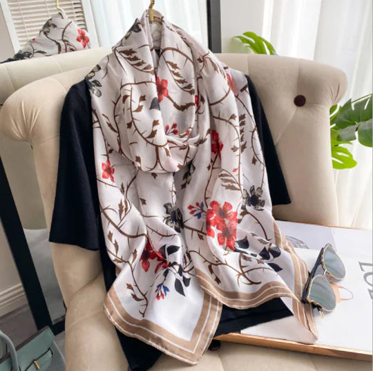 Luxury Silk Scarf This stunning luxury silk scarf is the perfect accessory for any woman. The beautiful print and colours make it perfect for summer, while the silk feeling fabric makes it soft and comfortable to wear. The Scarf is also large enough to be worn as a shawl or hijab, making it a versatile piece that can be worn in many different ways.