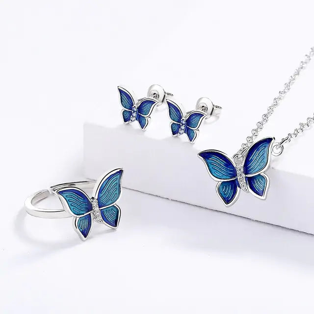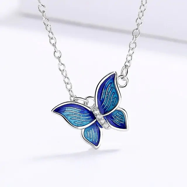 Introducing the Micro-Enamel Blue Butterfly Wings Necklace! This gorgeous necklace is crafted from 925 Sterling Silver and features three beautiful butterfly wings in a delicate blue enamel. It's the perfect accessory for any outfit, whether you're dressing up for a special occasion or just adding a touch of luxury to your everyday look. The dainty chain is adjustable, so you can wear it at the perfect length for you. And with its classic design, this necklace is sure to become a treasured part of your jewelry collection. So don't wait any longer, order your own Micro-Enamel Blue Butterfly Wings Necklace today!
