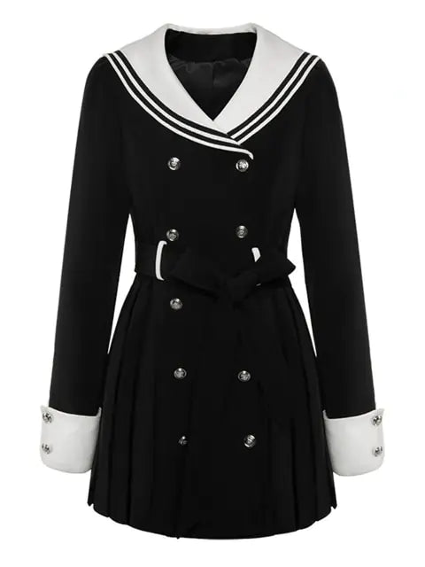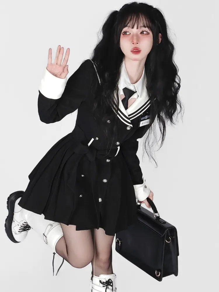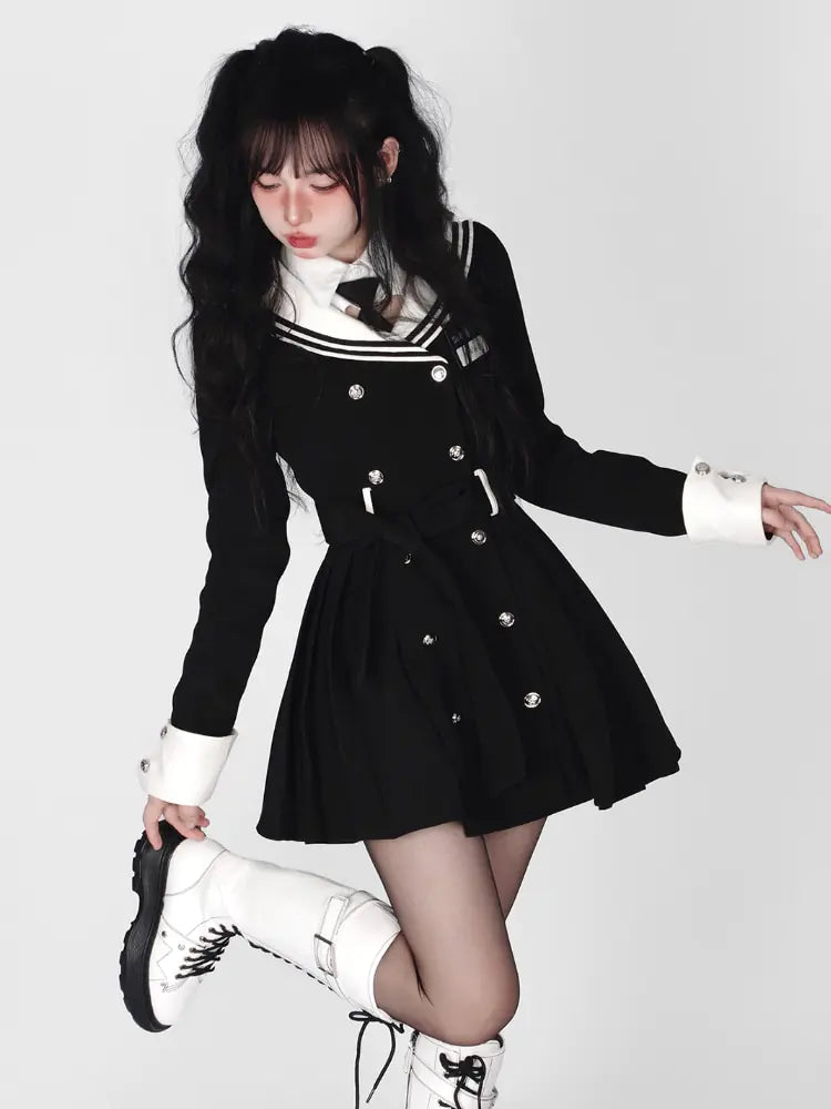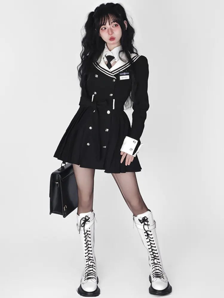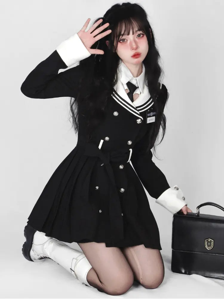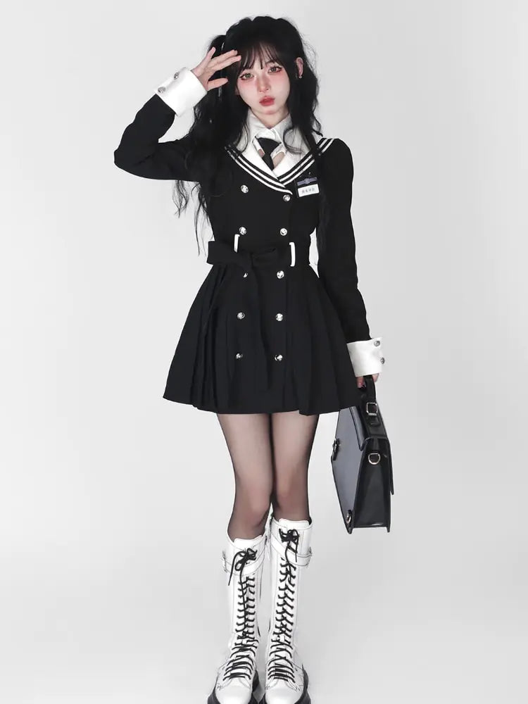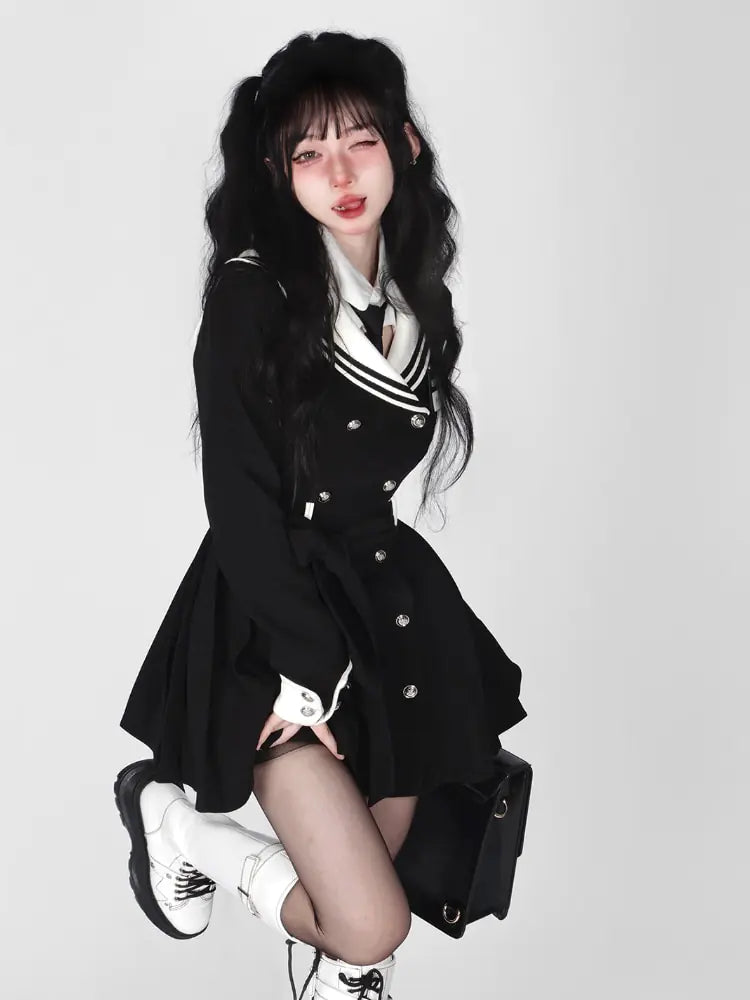 Look regal and elegant with the Navy Collar Korean Style Mini Dress. This beautiful black dress features a Korean style design with a navy collar for an extra touch of royalty. Perfect for any special occasion such as parties, weddings or graduations, you will be sure to make a lasting impression. The unique female long sleeve creates the perfect silhouette that is detailed with the college-style one-piece dress to create an unforgettable look. Crafted from high-quality material that feels luxurious against your skin, this dress is truly a sight to behold! Showcasing sophistication and grace, this stunning mini dress is ideal for anyone looking to make a statement on their next big night.