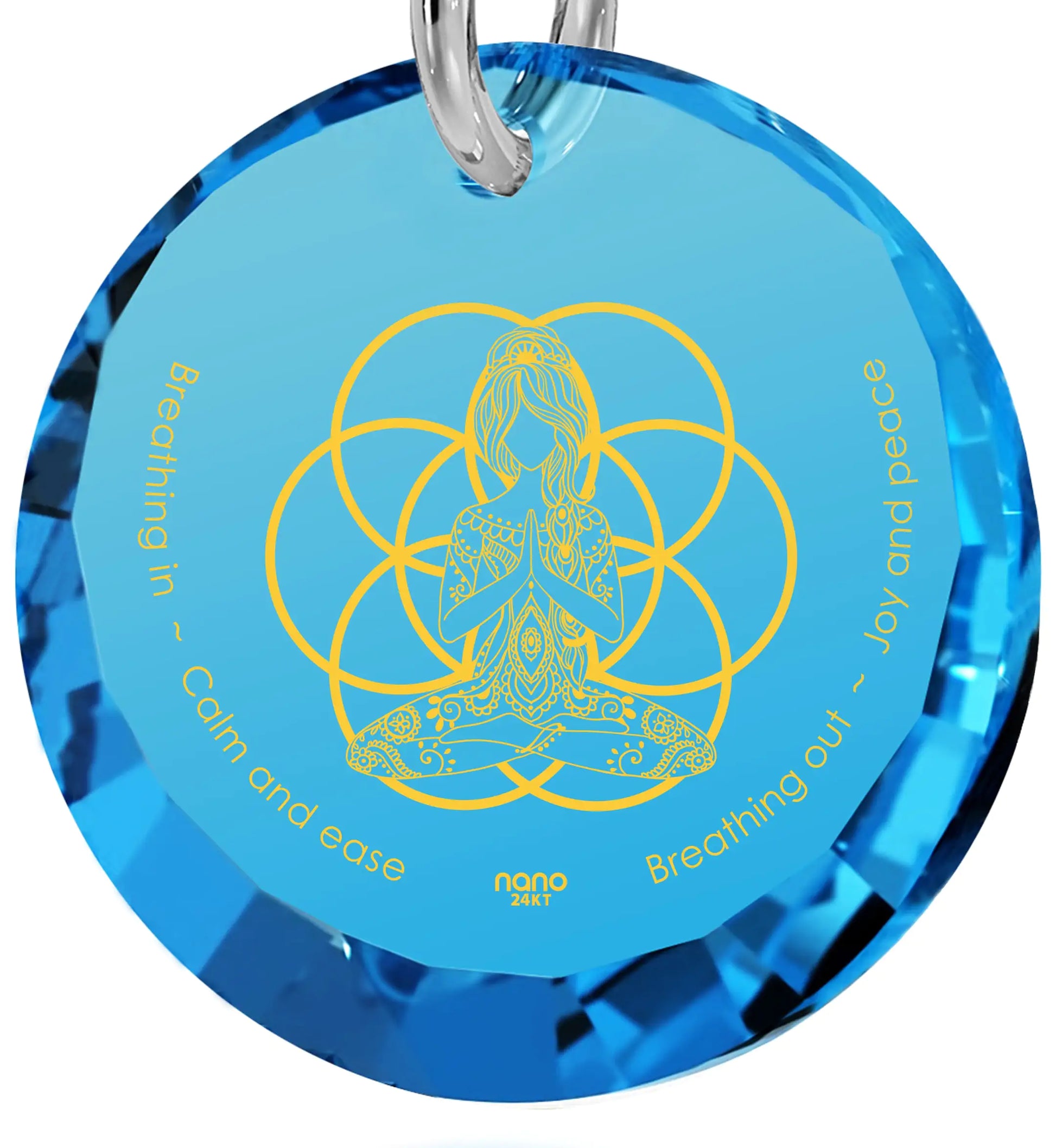 Elevate your spiritual journey with the Symbolic Yoga Pendant, a harmonious blend of design and meaning. This exquisite pendant features the mantra 'Breathing in - calm and ease, Breathing out - love and peace,' gracefully accompanying a tranquil yogi in the lotus pose, padmasana, while centered by the geometric seed of life. Intricately inscribed in radiant 24k gold onto a petite round faceted cubic zirconia gemstone charm, the pendant suspends gracefully from a 925 sterling silver chain. Symbolizing unconditional love, the seven chakras, and the rhythm of life itself, this pendant serves as a poignant reminder to find inner peace through mindful breathing. Whether a gift for a loved yogi or a personal accessory, let the Symbolic Yoga Pendant inspire your journey towards serenity and balance.
