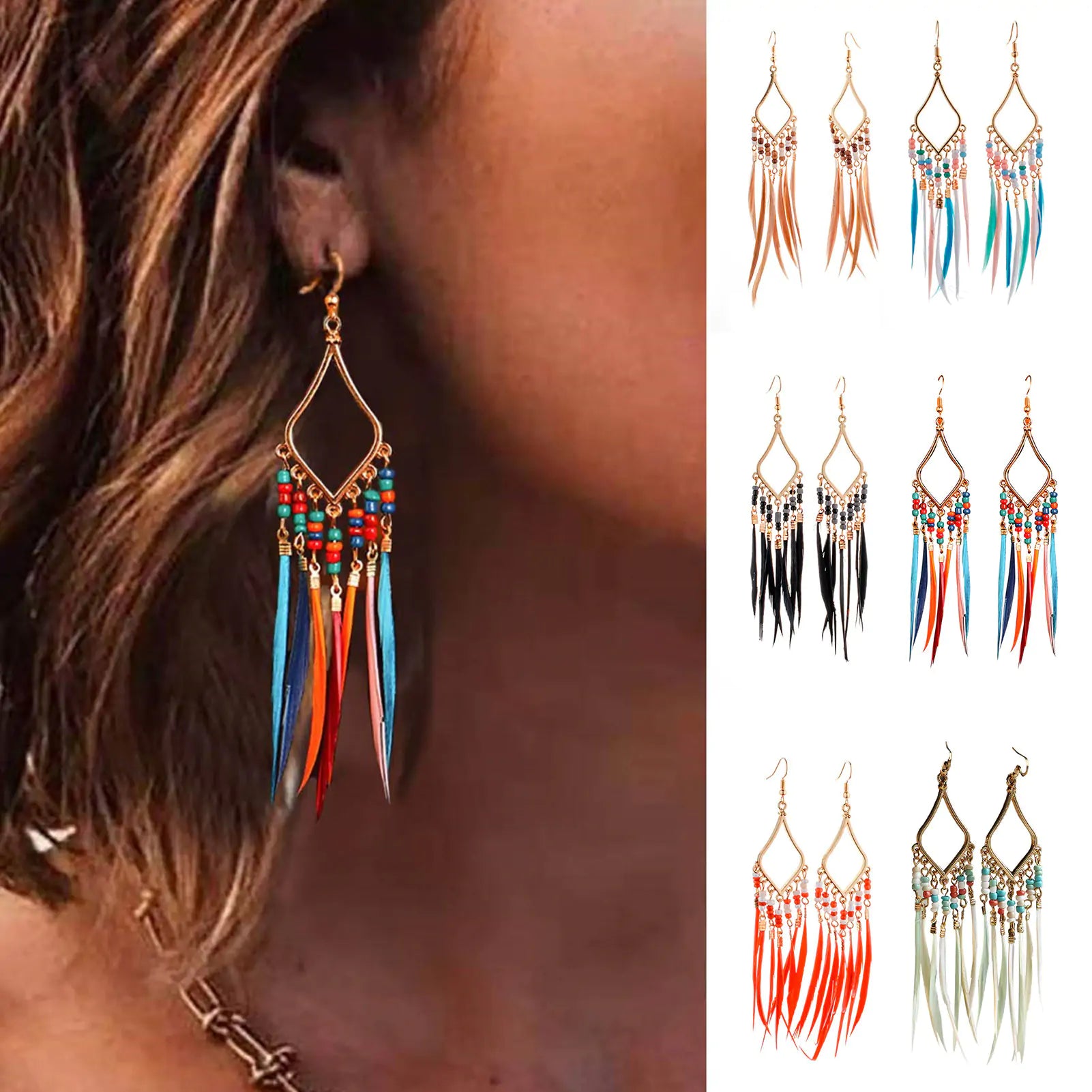 Introducing our Tassels Feather Earrings! These earrings are perfect for adding a touch of elegance and charm to any outfit. They are made with colorful beads and tassels, and have elastic buckles for easy on and off. They are also wide enough to be worn on any occasion, from parties to everyday wear. Plus, they make an ideal gift for any special occasion. So don't hesitate, grab a pair of our Tassels Feather Earrings today!