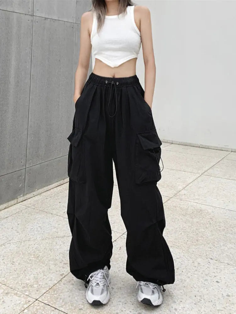 Discover style and comfort when you shop women's techwear cargo trousers from [brand name]. With ever trendier streetwear options for 2019, these ultra-stylish Korean Harajuku parachute track pants feature a classic and versatile wide leg jogger cut. Whether you're hitting the gym or just looking to stay on-trend, these trousers are all you need. Crafted with a blend of high quality fabrics for superior durability and extreme comfort, they will be your favorite sweatpants whether you're out running errands or lounging around the house. Choose from an array of colors, sizes, and lengths to suit your individual look and perfect your wardrobe. Shop [brand name] today for modern techwear at its best!