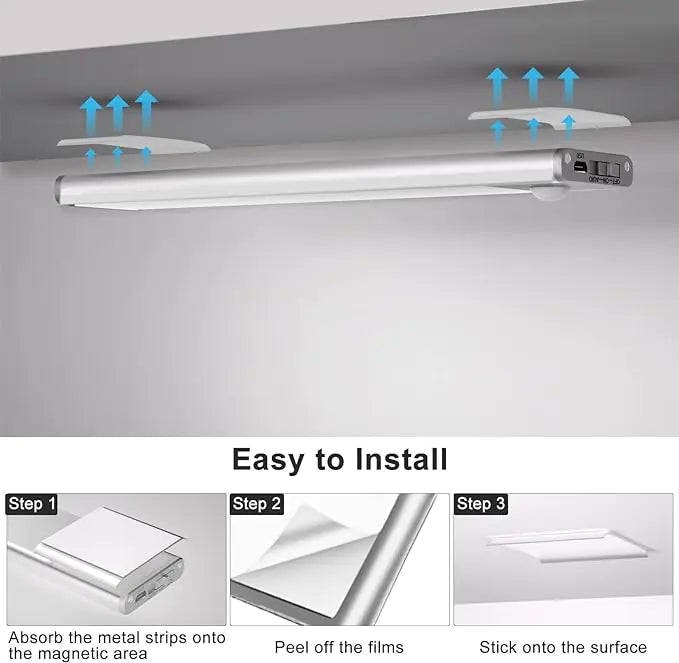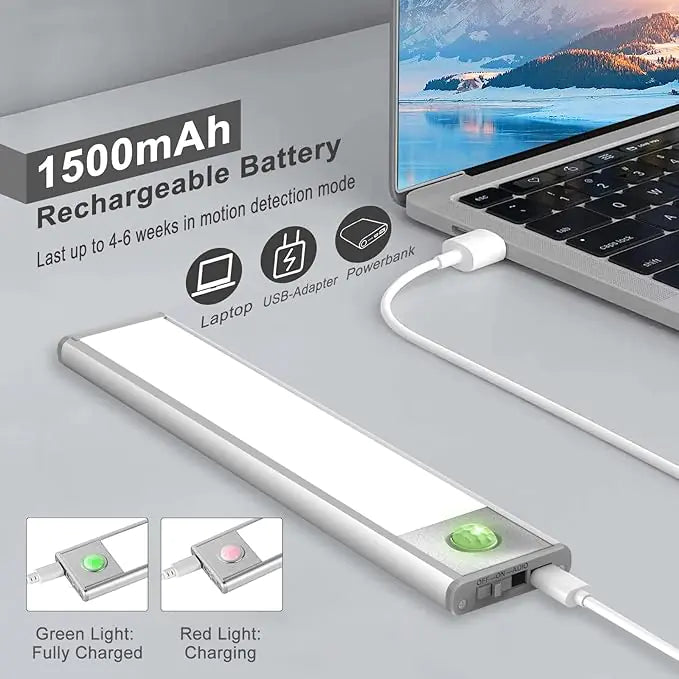 Experience seamless and hands-free lighting with our Cabinet Lights, perfect for your kitchen and beyond. With an 11 ft effective trigger distance and a broad 120° trigger angle, these lights bring convenience and efficiency to your space. In 'Auto' mode, they respond to motion in the dark, automatically switching off after 30 seconds of inactivity. Powered by a 1500mAh rechargeable battery, they offer extended battery life, easily rechargeable via the included USB cable, providing 8-10 hours of illumination in 'ON' mode and up to 4-6 weeks in motion sensor mode. These lights feature advanced LED side light technology for even, glare-free brightness. Equipped with strong magnets and easy installation options, they are versatile and durable, adding effortless illumination wherever you need it.